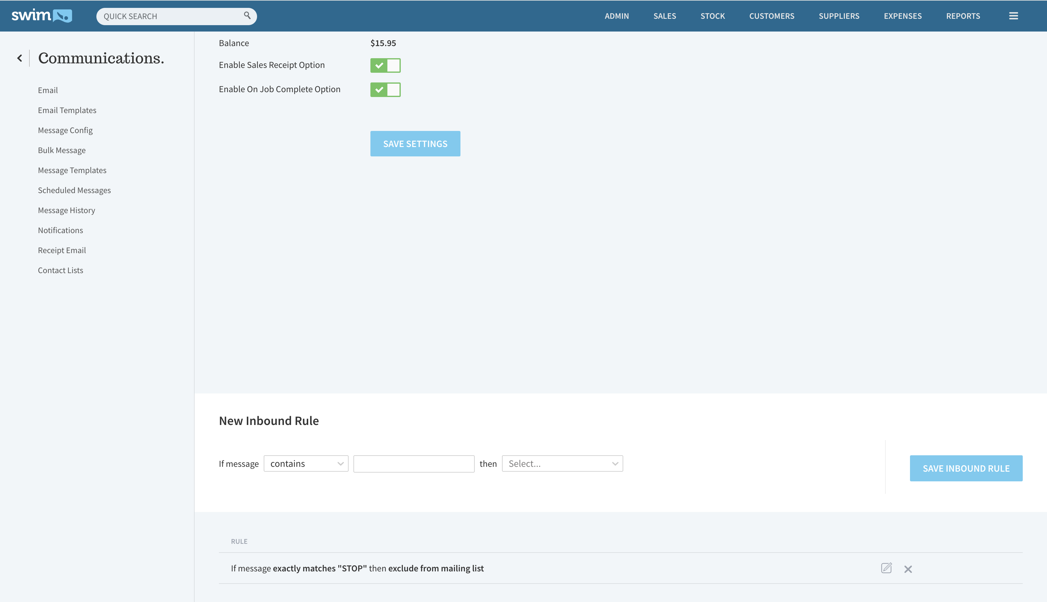 Inbound rules allow Swim to perform automated actions based on how customers reply to your messages. A common example is handling opt-out requests.