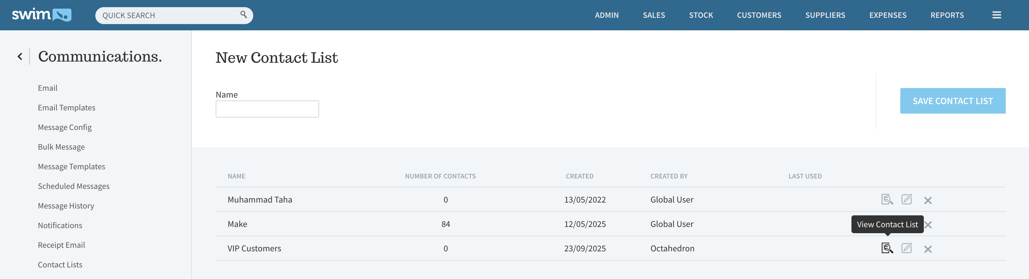 Contact lists are self-managed marketing lists that can be used when sending bulk marketing messages in Swim.