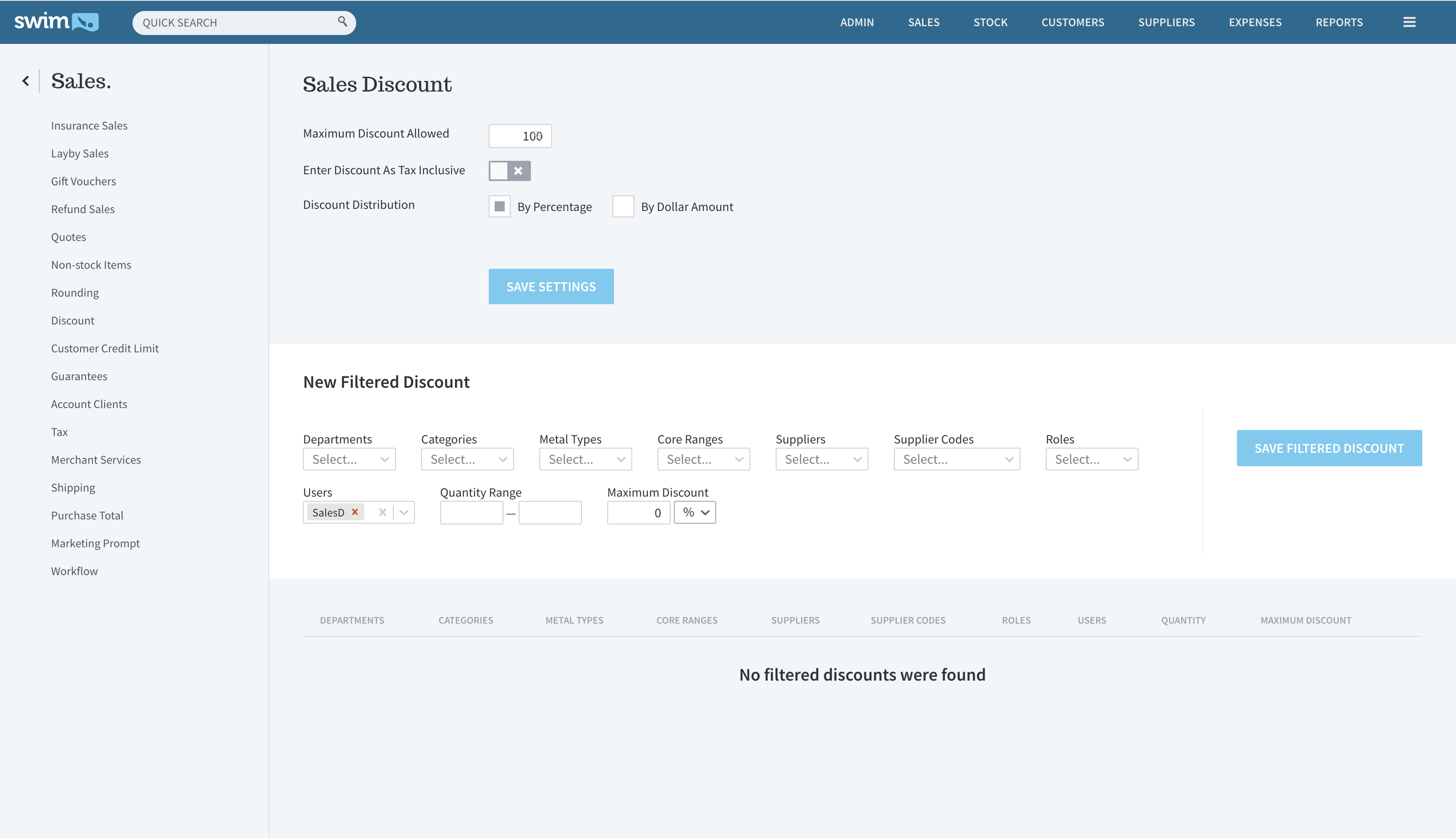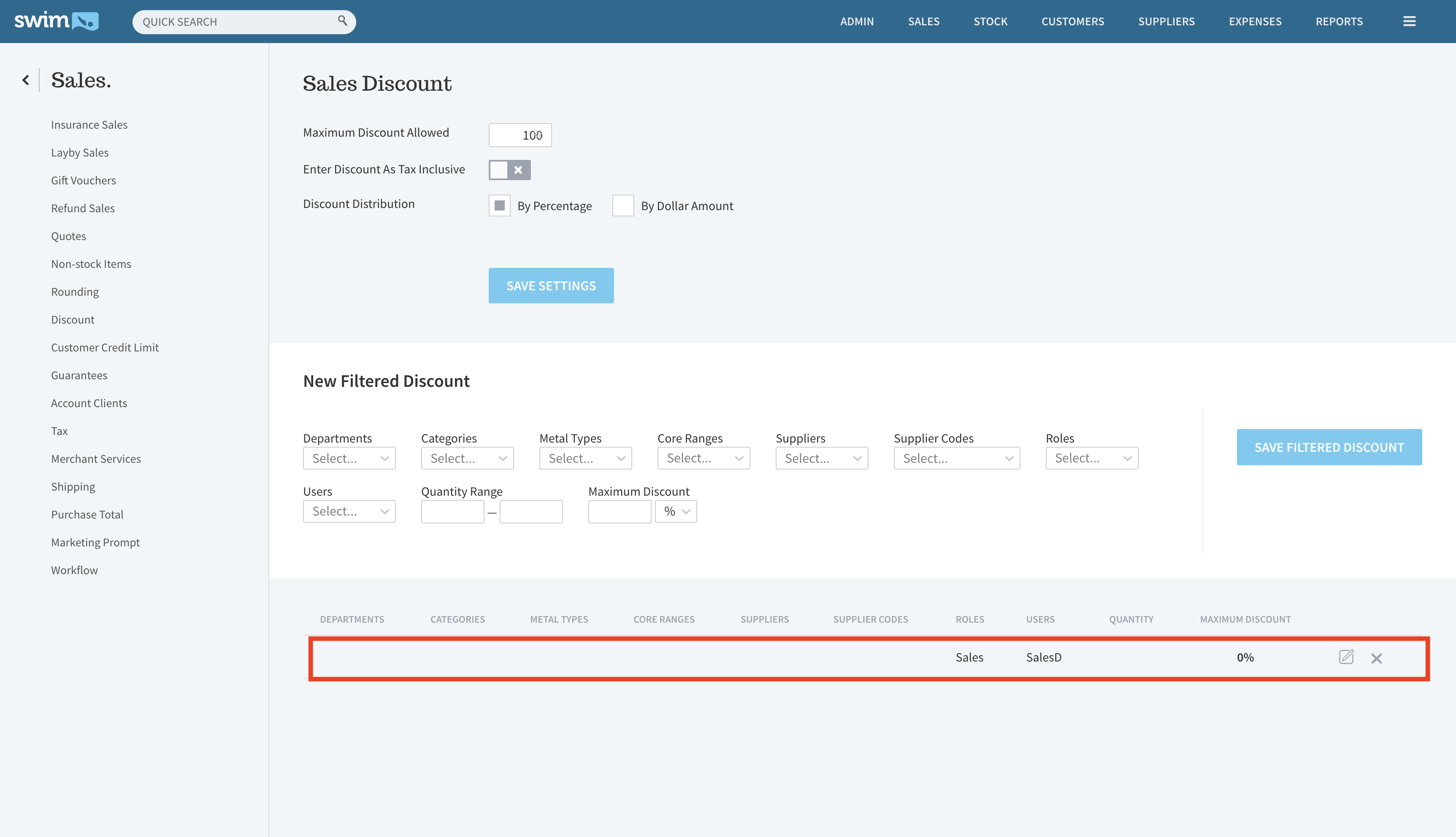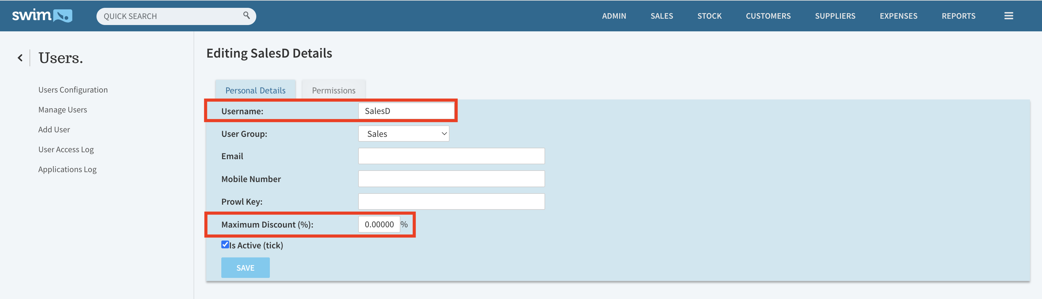 The ‘Maximum Discount’ Field in the Editing User Details section defined how much a user can overwrite discounts on a sale (with manager approval).