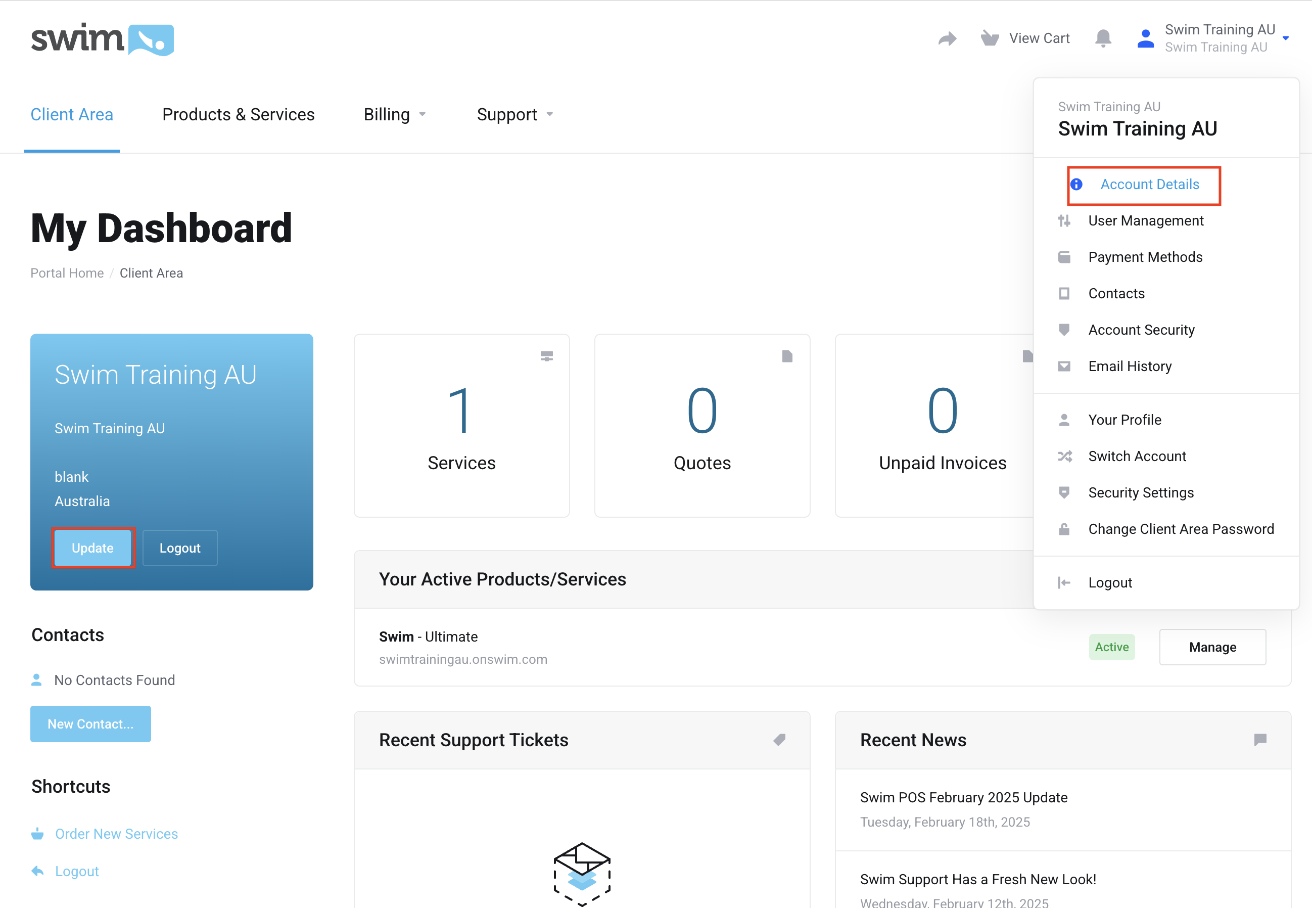 If you need to reset or update your Swim Store login details, this can be done via the Client Area.