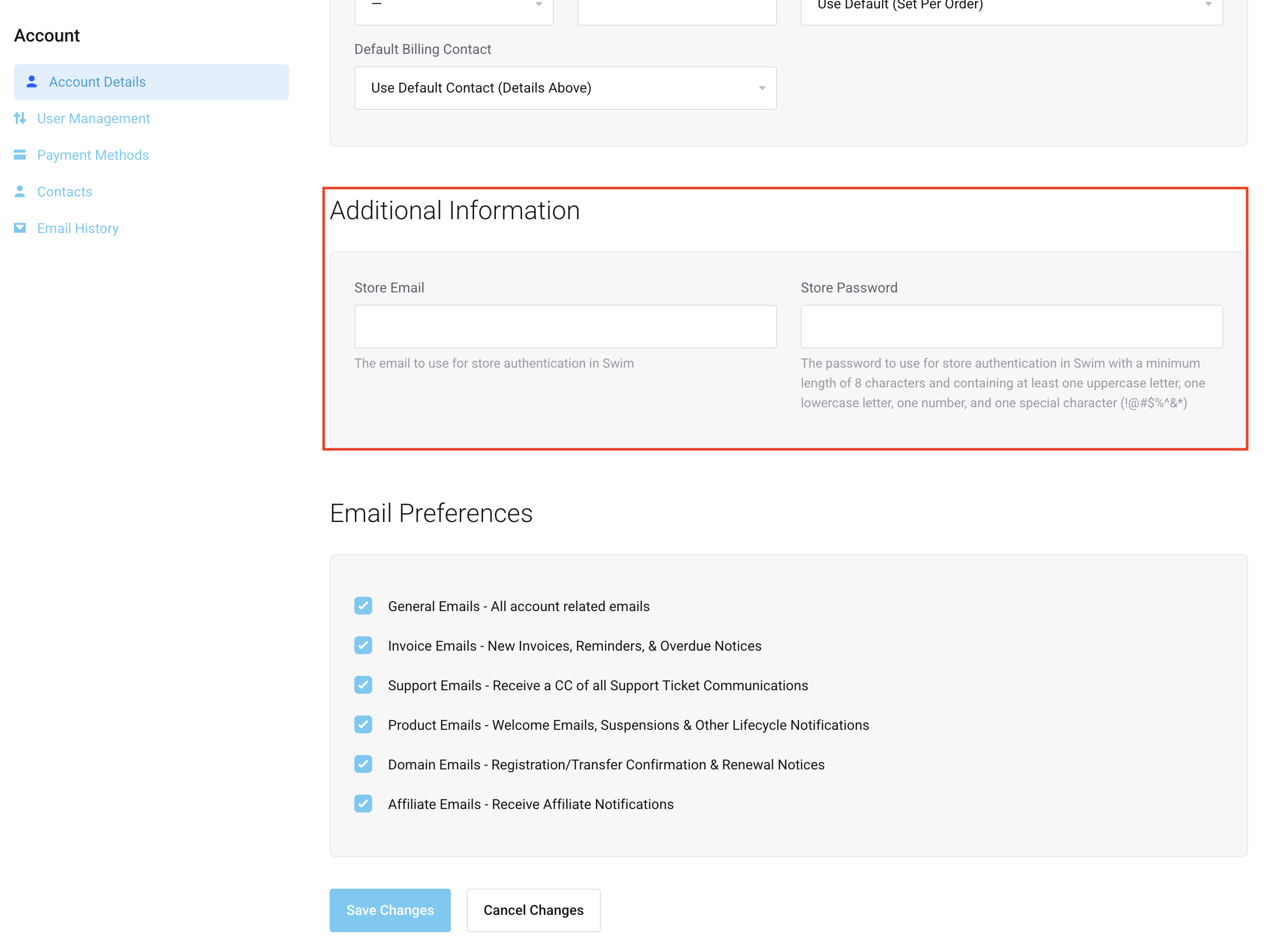 The Swim Store Email  and Store Password are the credentials used to log in to your Swim POS. They may be different from your Client Area login details.